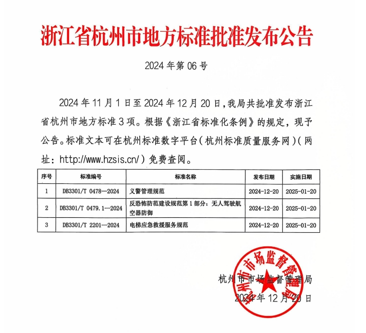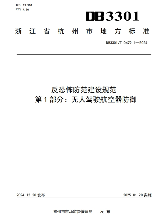 12月20日,由杭州市公安局牵头,qy球友会QY创投投资企业—杰能科世作为第二起草单位全程参与编制的《反恐怖防范建设规范 第1部分:无人驾驶航空器防御》杭州市地方标准,取得了杭州市市场监督管理局的批准并正式发布,将于2025年1月20日实施。