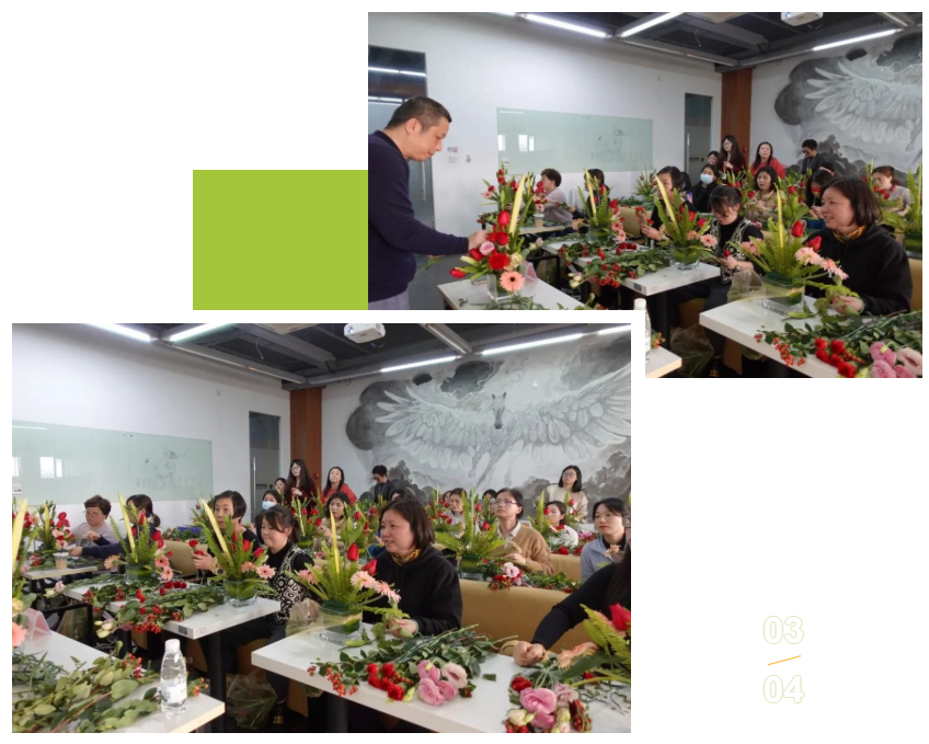 讲座中,老师讲解了花艺的基本知识、各种花材花语以及选花修枝、插花搭配技巧等内容,现场示范指导大家做出一个个精美别致的插花作品。