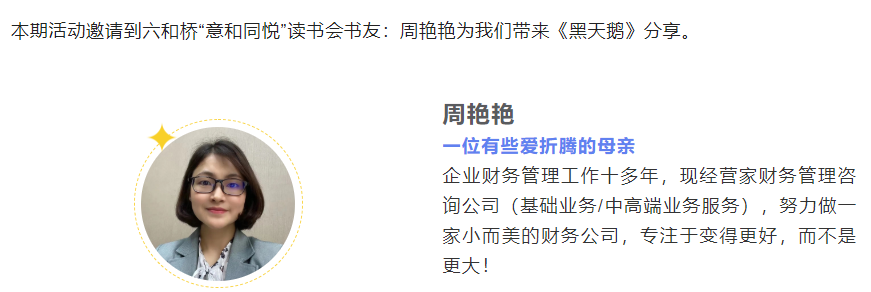 活动中,周艳艳对《黑天鹅》一书拆解为三个部分:第一部分为极端斯坦与黑天鹅现象(1至9章),第二部分为我们难以预测(10至13章),第三部分为极端斯坦的灰色天鹅(14至18章)。并从是什么?认知本质,如何应对三个维度与在座的书友进行探讨。
